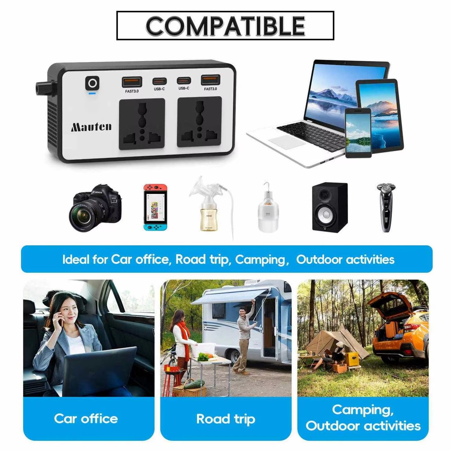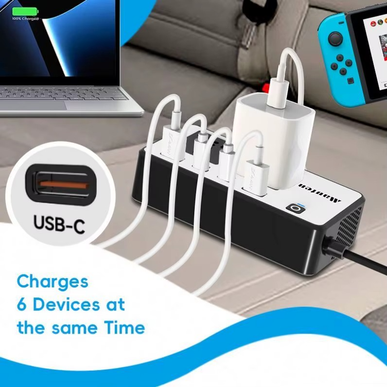 200W gücündə, avtomobil üçün nəzərdə tutulmuş inverter. Cihaz 12V/24V modelləri ilə uyğundur. Avtomobil elektrik cihazları və rəqəmsal cihazlar üçün DC çıxışı ilə təchiz edilib. Cihazda USB və Type-C portları da mövcuddur.
