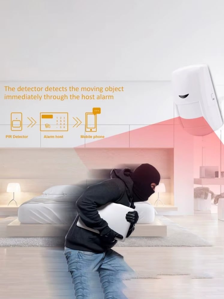 Once the motion sensor detector detects the moving object, it will immediately send the wireless signal to the alarm panel, and then the alarm panel will send the alarm message to your mobile phone.